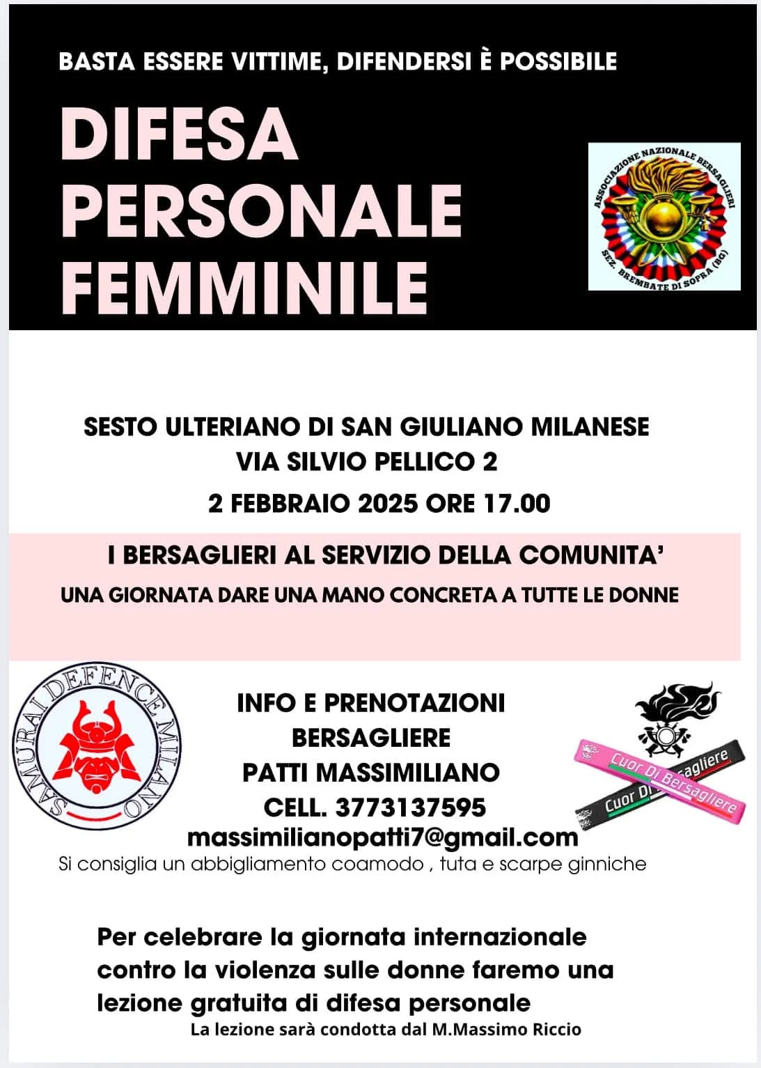 Si Γ¨ concluso il primo appuntamento, con grande partecipazione nel Comune di San Giuliano Milanese frazione Sesto Ulteriano, il primo corso di difesa personale, rivolto alle donne del luogo. Lβiniziativa, organizzata dal Bers. Massimiliano Patti, iscritto alla Sezione Bersaglieri di Brembate Sopra e maestro nel gruppo "Cuor di Bersagliere", ha fornito alle partecipanti gli strumenti essenziali per migliorare la propria sicurezza e consapevolezza.